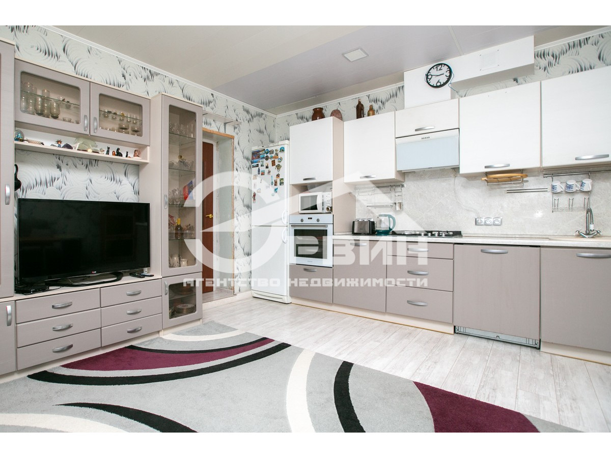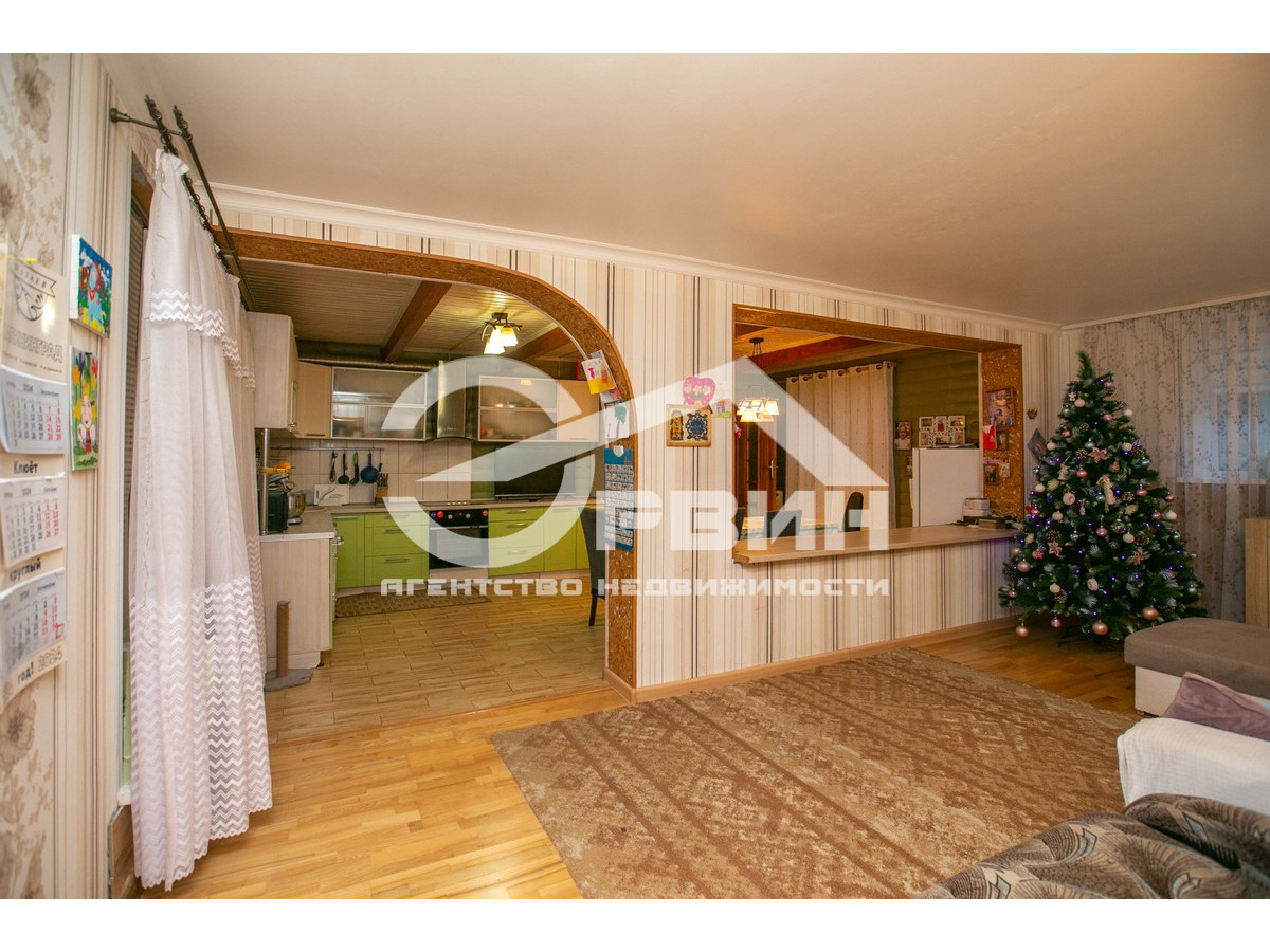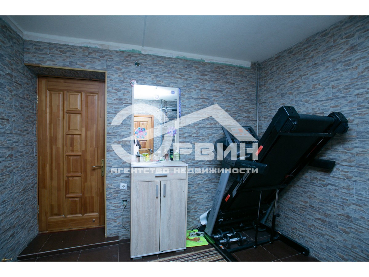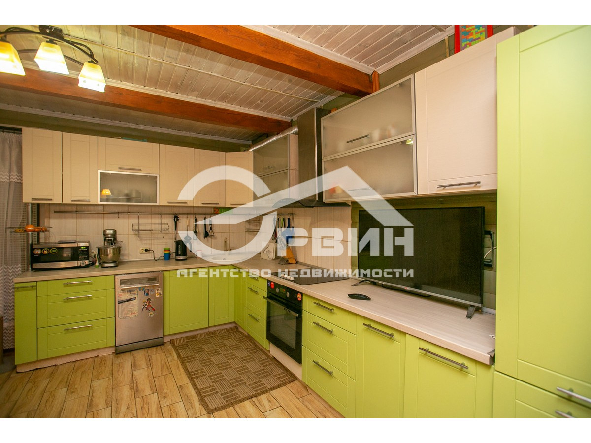 Кухня-столовая и гостиная разделены барной стойкой. Кухня укомплектована кухонной мебелью, посудомоечной машиной, духовкой, варочной панелью, вытяжкой, каменной раковиной, холодильником DAEWO. Гардеробная оборудована мебелью ALFA. Спальня - трехстворчатым шкафом, телевизором, угловым компьютерным столом. Ванная комната, душевая и санузел выложены кафелем. На всем цокольном этаже – теплый пол.